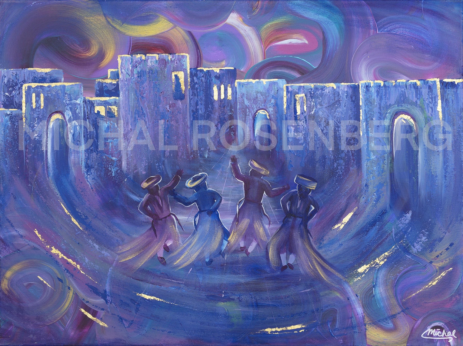 In this enchanting blue and purple painting, the ancient streets of the Old City of Yerushalayim come to life as Chassidim dance joyously amidst swirls of golden light. The deep blues and purples evoke the timeless aura of the city's cobblestone pathways and towering walls, while swirls imbue the scene with a sense of Divine presence and celebration. The Chassidim, depicted in traditional holiday attire, move with exuberance and unity, their figures illuminated by the golden light that infuses the entire atmosphere. Through this enchanting portrayal, the painting invites viewers to experience the spiritual vibrancy and timeless beauty of Jewish tradition within the heart of Jerusalem's historic landscape. Dimensions: 18”H x 24”W