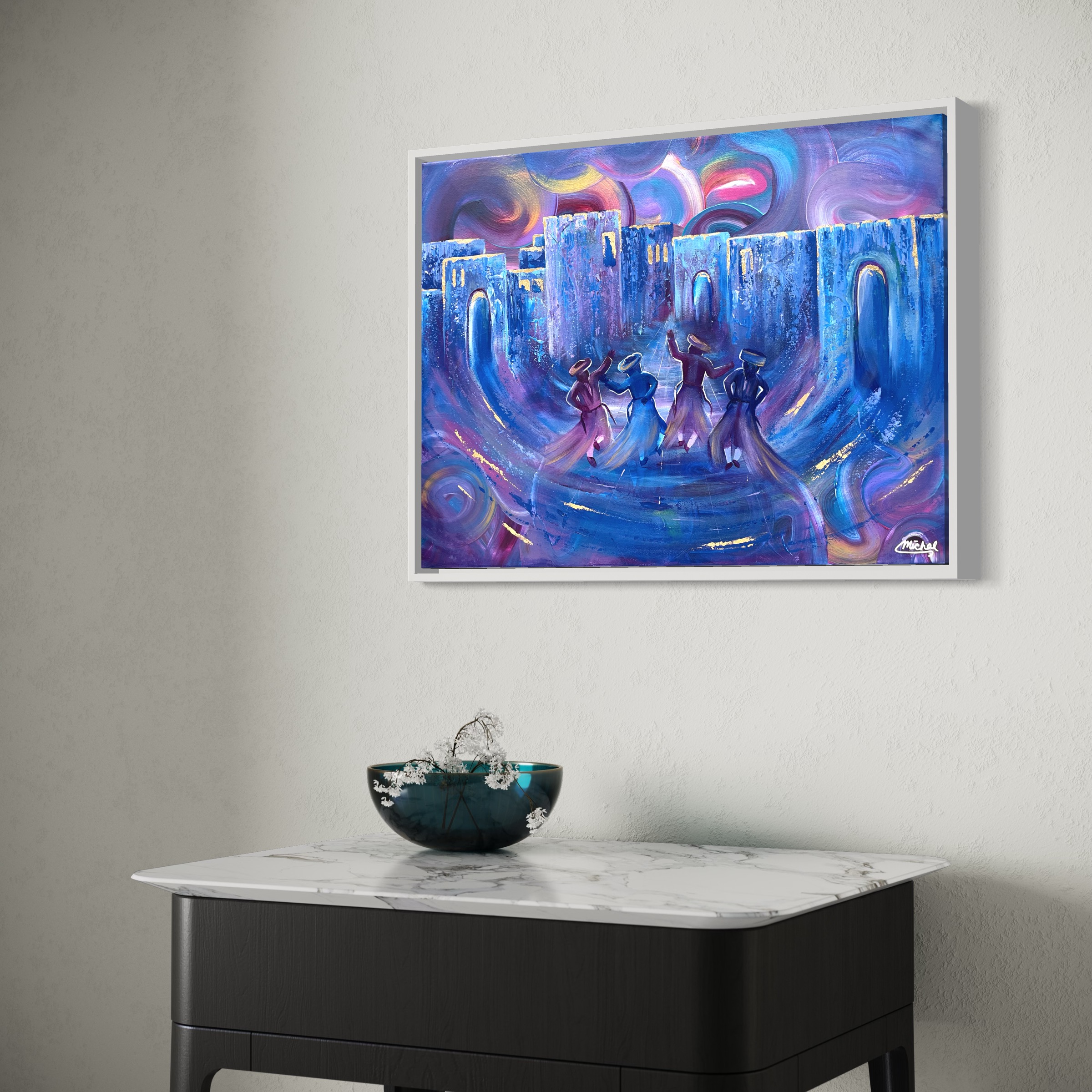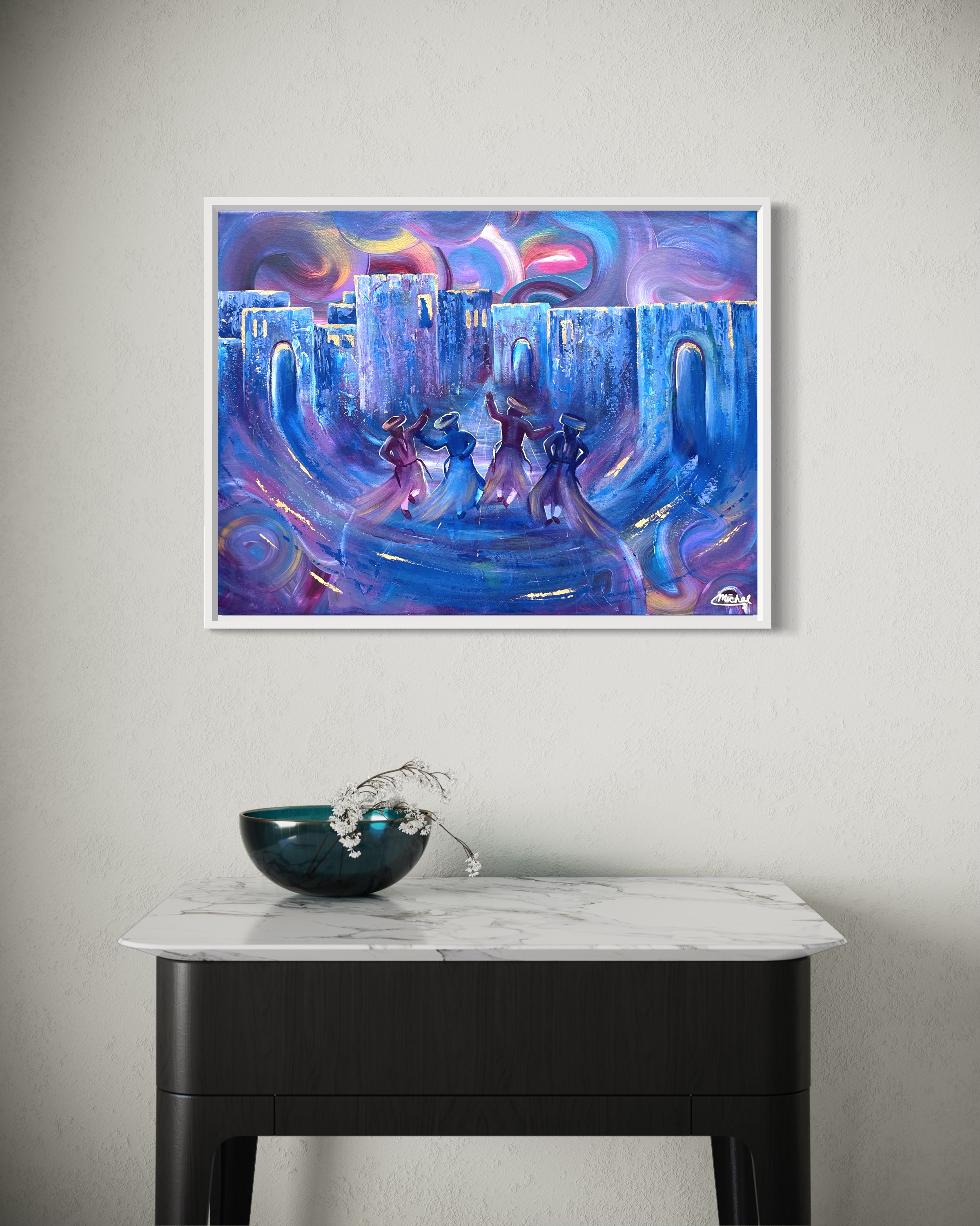 In this enchanting blue and purple painting, the ancient streets of the Old City of Yerushalayim come to life as Chassidim dance joyously amidst swirls of golden light. The deep blues and purples evoke the timeless aura of the city's cobblestone pathways and towering walls, while swirls imbue the scene with a sense of Divine presence and celebration. The Chassidim, depicted in traditional holiday attire, move with exuberance and unity, their figures illuminated by the golden light that infuses the entire atmosphere. Through this enchanting portrayal, the painting invites viewers to experience the spiritual vibrancy and timeless beauty of Jewish tradition within the heart of Jerusalem's historic landscape. Dimensions: 18”H x 24”W